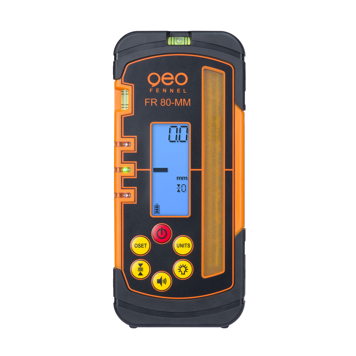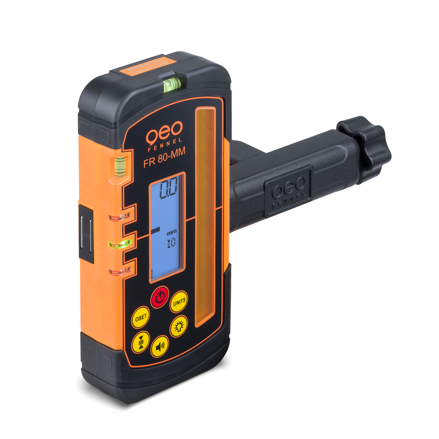 The geo-FENNEL FR 80-MM laser receiver features a digital laser height display in mm, an extra-long 120 mm reception field and is ideal for rotary lasers with a red or green laser beam.Like other receivers in this series, the FR 80-MM is characterized by its robustness in accordance with IP67. The easy-to-read, illuminated display with LED indicator and the metal retaining clip for the leveling staff offer the user the best possible working conditions, and the FR 80-MM is the only receiver in this series that allows the user to freely define the "0" position (offset).
